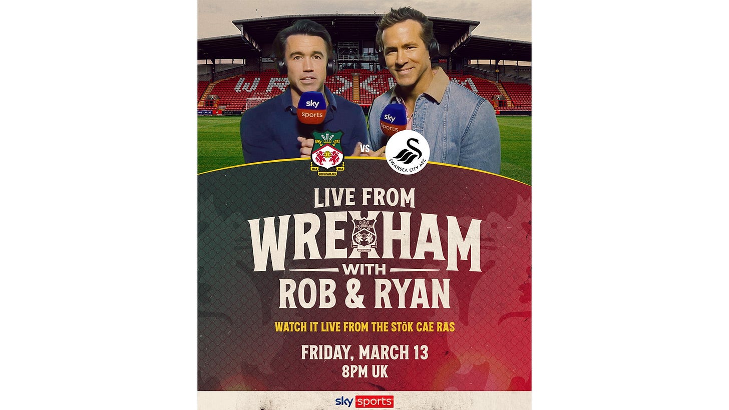 Sky Sports has partnered with Wrexham AFC co-chairmen Rob McElhenney and Ryan Reynolds for a special one-off broadcast during Wrexham’s EFL Championship clash against Swansea City on Friday 13 March.