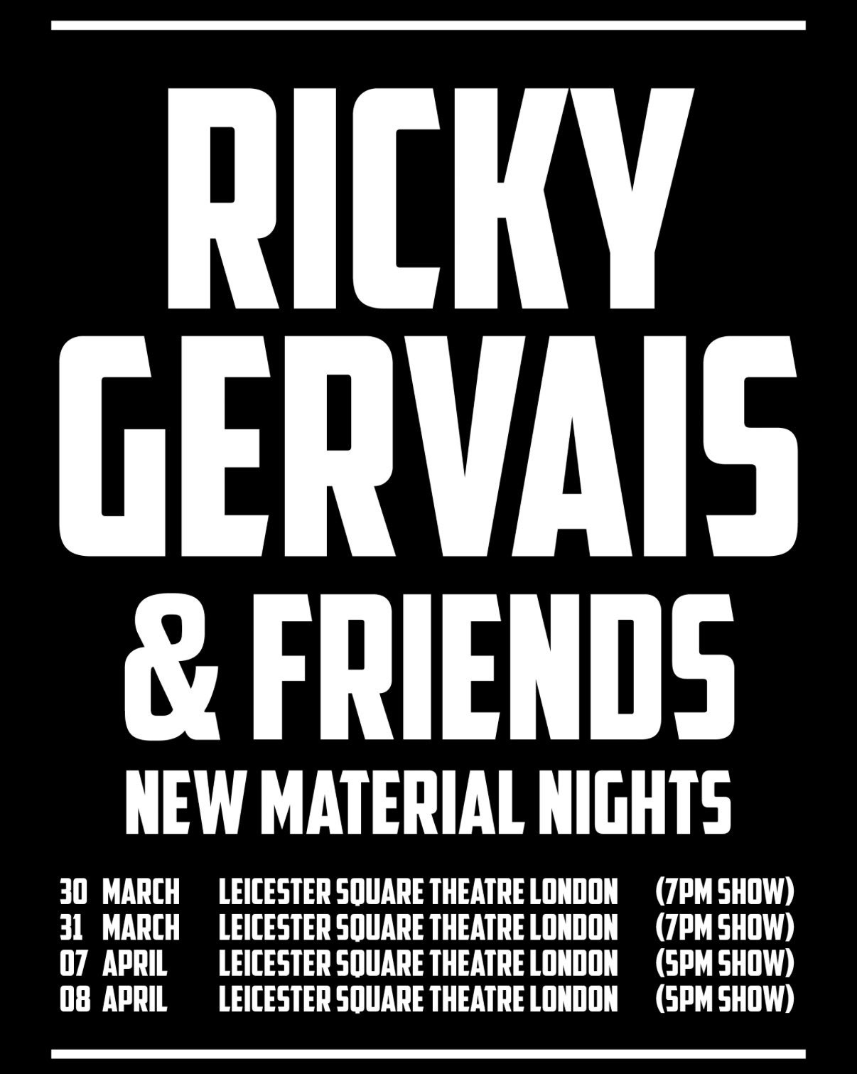 Where to watch Ricky Gervais's New Material Nights this March and April, and how to get tickets.
